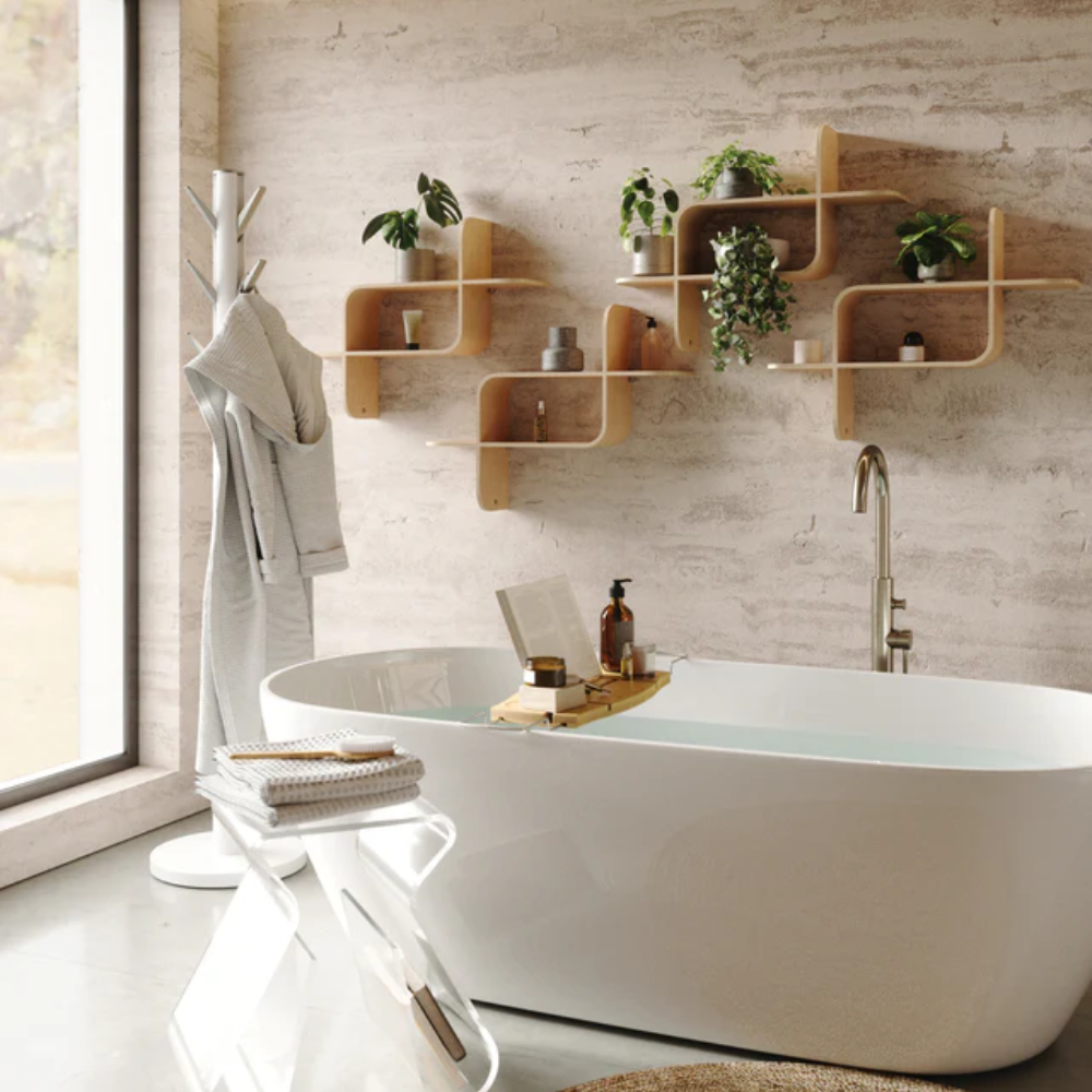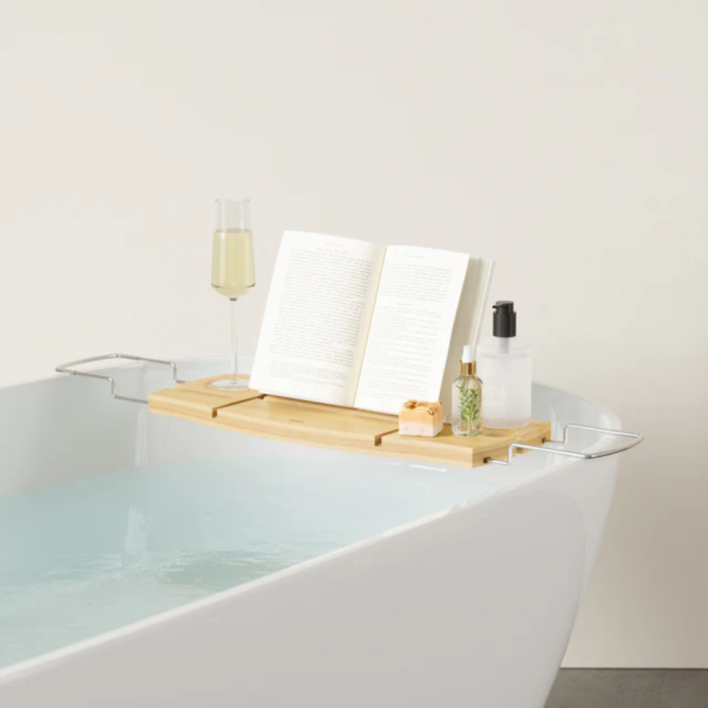 Vivez l’expérience ultime de l’heure du bain avec le plateau de baignoire Aquala de Umbra, le luxe simplifié. Fabriqué en bois naturel, Aquala évoque instantanément une ambiance spa grâce à son design chaleureux et ses fonctionnalités bien pensées. Ce plateau de bain extensible est conçu pour accueillir vos essentiels : livres, tablettes, téléphones, verres, avec un support dédié pour téléphone, un double crochet pour luffa, et une barre centrale pour maintenir votre lecture bien droite. Les bras antidérapants en silicone assurent une stabilité parfaite sur les bords de la baignoire.
