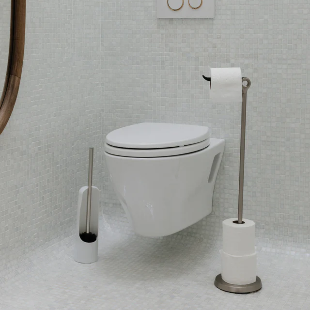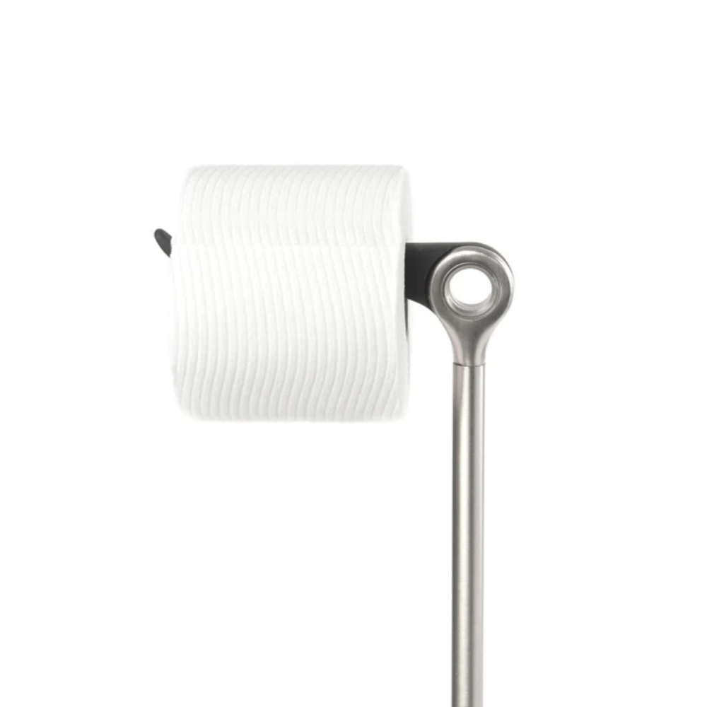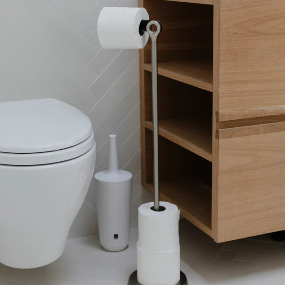 Le porte-papier toilette Tucan de Umbra est une solution élégante et fonctionnelle pour les salles de bain modernes. Ce support autoportant au design épuré est doté d’une réserve verticale intégrée pouvant contenir jusqu’à cinq rouleaux de papier toilette, en plus d’un rouleau en distribution.Sa tête de distribution rabattable permet un chargement facile et une utilisation intuitive : soulevez pour insérer les rouleaux, rabattez pour distribuer.