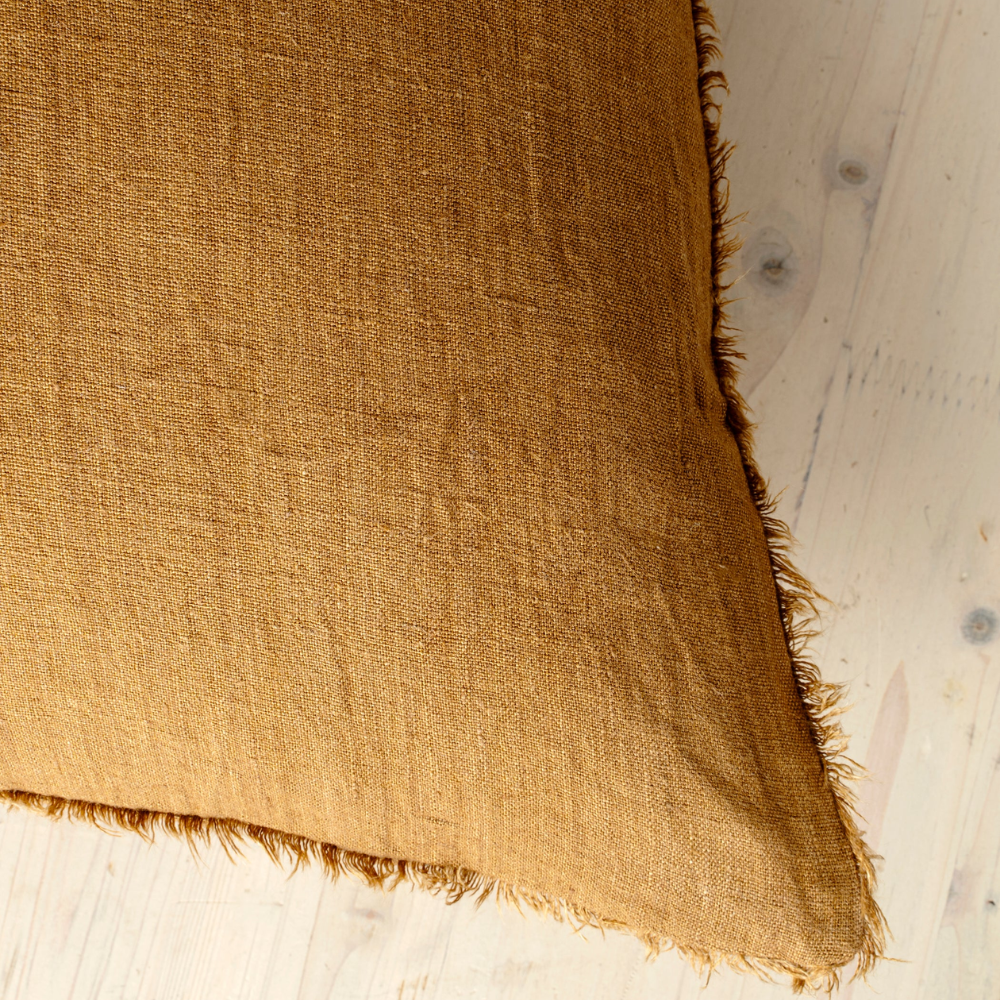 Coussin Lina en lin doré 24’’ x 24’’ bord effiloché style artisanal par Indaba