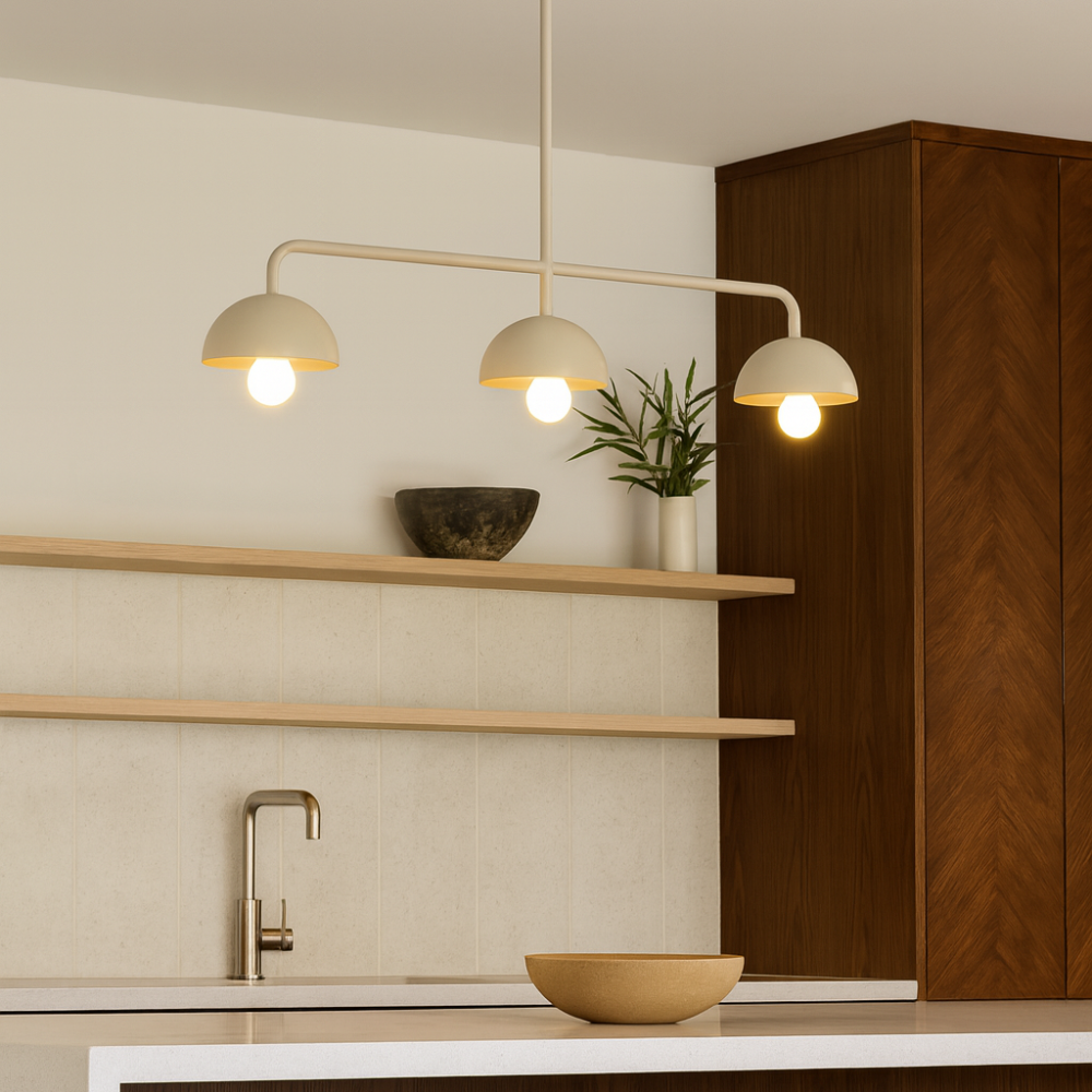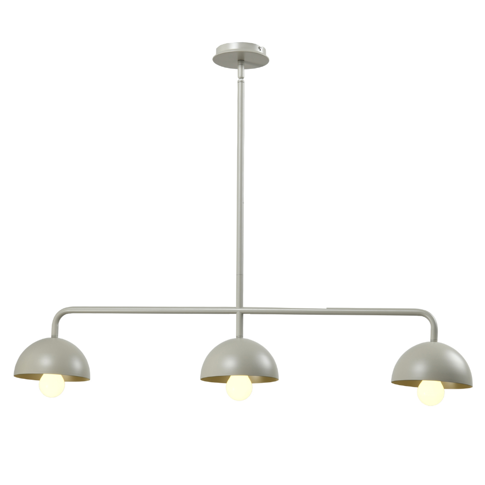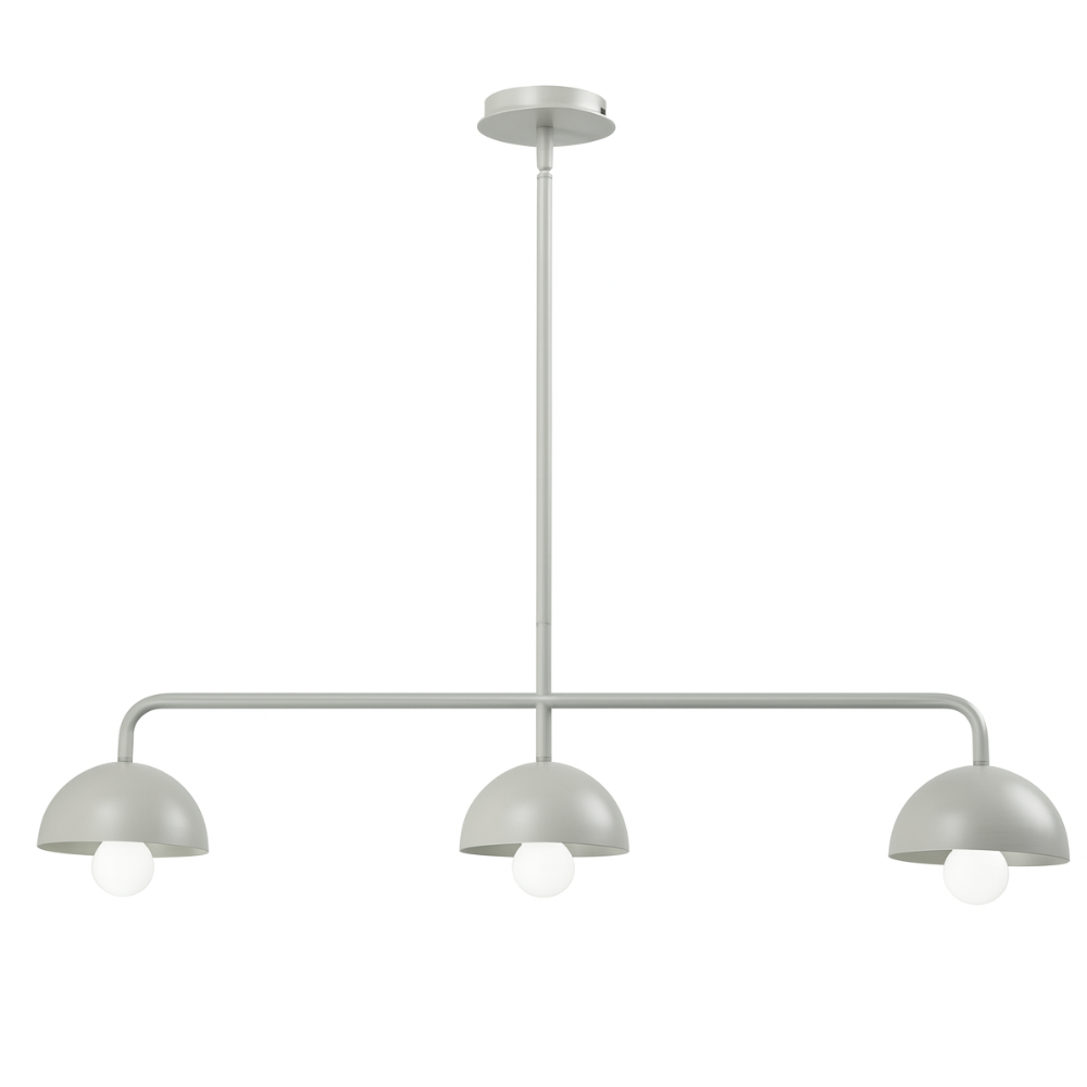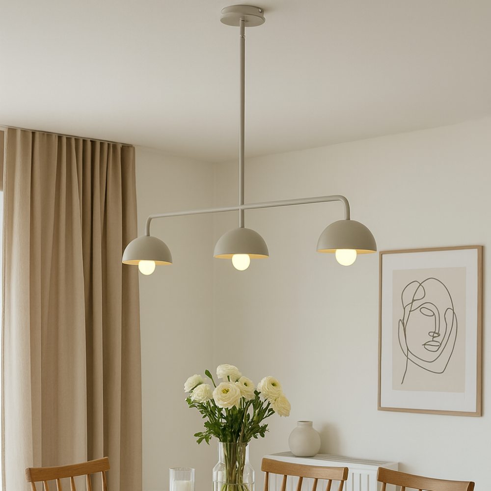 Ce luminaire au style minimaliste dôme avec 3 abat-jours greige, rehaussé par une structure métallique aux lignes droites et équilibrées, s’intègre harmonieusement autant dans un décor contemporain que scandinave ou classique. Parfait pour créer une ambiance accueillante dans la salle à manger, au-dessus d’un îlot de cuisine ou même dans un espace de travail.